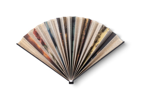 A legyező autentikus vintage grafikai stílusban készül, valódi buckram hatású borítással, fóliázott részletekkel és szalagjelzővel. A belső ,,könyvlapok" kiváló minőségű papírra nyomtatott, tematikusan illeszkedő mintákat tartalmaznak, amelyek kinyitva különleges vizuális élményt nyújtanak.