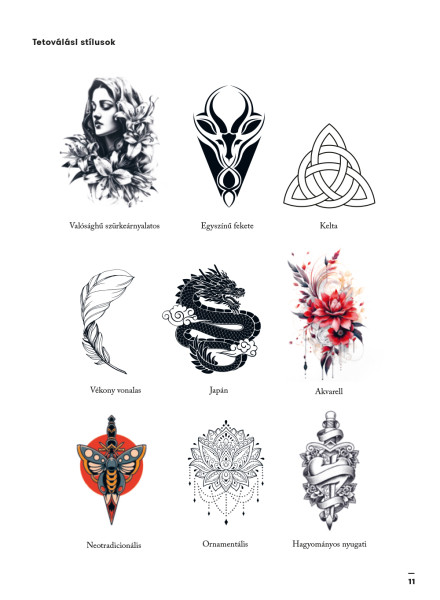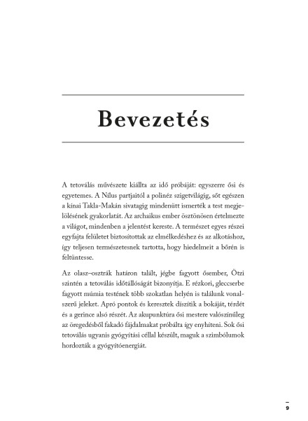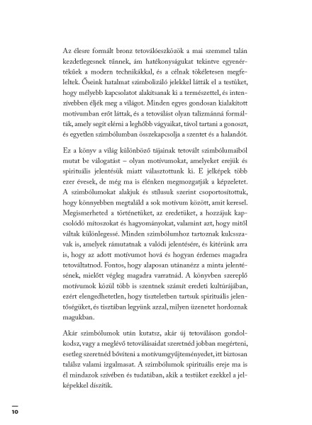 Ez a kötet a tetoválható minták rendkívül gazdag tárházát kínálja - a letisztult vonalrajzoktól kezdve a növény- és állatmotívumokon át egészen a csillagjegyekig és a mitológiai alakokig -, miközben minden egyes szimbólum jelentését, történetét és kulturális hátterét is részletesen bemutatja.
