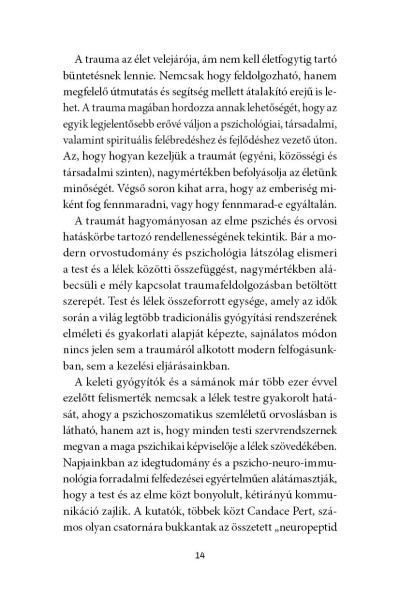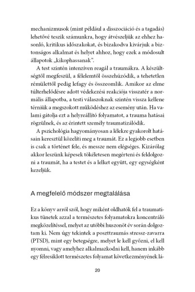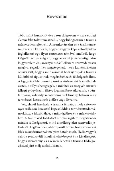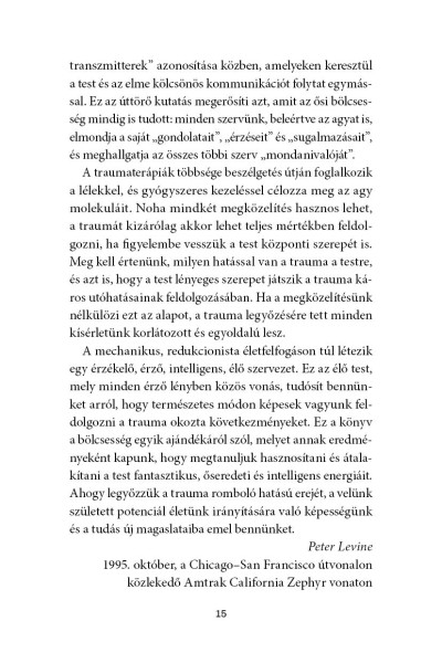 A Somatic Expreriencing testfókuszú terápia megteremtője immáron klasszikussá vált művében az idegtudomány, a fiziológia és a pszichológia eredményeinek ötvözésével forradalmasította azt, ahogyan a traumára tekintünk, és a traumafeldolgozás máig érvényes alapjait fektette le. Levine szerint a trauma nem "hiba a rendszerben", nem örökre szóló ítélet, hanem az élet természetes velejárója, és fizikai és mentális tüneteink számottevően enyhíthetők, ha figyelünk a testünk jelzéseire, és felébresztjük velünk született, ösztönös képességünket a gyógyulásra.