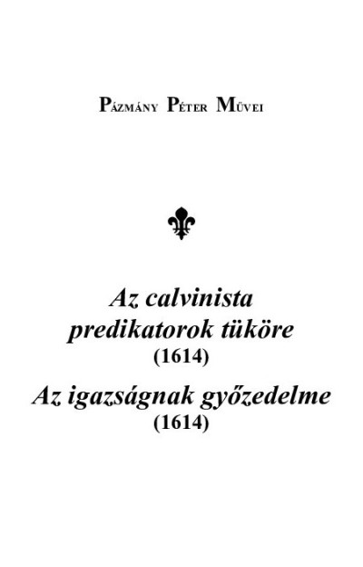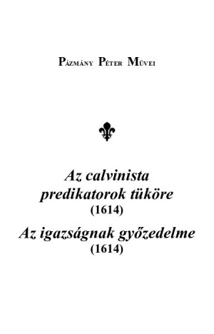TARTALOM 1. ELŐSZÓ 5 2. FŐSZÖVEGEK 2.1 AZ CALVINISTA Predikatorok igyenes erkeolcseu tekelletessegének, TEVKEORE 7 ELÖLIARO LEVEL 9 ELSEO RESZE: Mi adot okot ez irasocskára 10 MASODIK RESZE. Czimeres hazugsági az Calvinista Beszélleonek 12 HARMADIK RESZE. Rauasz alnaksága az BESZED szerzeonek 15 NEGYEDIK RESZE. Meli bolondul bizonittya az Beszed szerzeo Calvinista, hogy az Szenteket nemkel segitségeul hínúnk 19 FELELET 22 FELELET 23 FELELET 24 2.2. AZ, IGAZSAGNAK, GYEOZEDELME. MELLYET, AZ ALVINCI PETER, TEVKEOREBEN, meg mutatot. Pazmany Peter 27 ILLUSTRISSIMO [...] Francisco Forghhacs [...] Perpetvam Felicitatem Precatvr. THOMAS BALASFI ELECTVS EPISCOpvs Bosznensis 29 REVERENDISSIMO DOMINO, DOMINO THOMAE Balasfi [...] SALVTEM A DOMINO. Petrvs Pazmany 31 AZ Szent Istenteól, Aluinci Peternek, io lelki ismeretet kiuanok 31 I. RESZ. Az elöl íáró leuelre, és az Tükörnek elsö részére, lelki isméreti ellen ád választ Aluinci 33 II. RÉSZE. Az, Tukörnek masodik részét Lelki ismereti ellen turkállya Aluinci 37 III. Az Tükörnek harmadik részét mint marczonghia Aluinci 43 IV. RESZ. AZ Tükörnek, Negyedik részében modotlanúl akadoz, Alvinci 53 Baratsagos intésem Aluincihoz 70 ALVINCI PETERNEK, [...] Balasfi Tamas, Bosznai Püspök 72 Post scripta 89 XENIA PETRO ALVINCIO CASSOVIENSI CALVINISTAE Praedicanti offerunt, PETRVS ALVINCI 93 3. JEGYZETEK 3.1. A szöveg átírásának és kiadásának elvei 99 3.2. A művek létrejöttének körülményei, kiadásai és utóélete 102 3.2.1. A Lelki orvosságra, illetve az ahhoz kapcsolódó "előbeszédre" vonatkozó információk és az azokból fennmaradt idézetek Az calvinista prédikátorok tükörében és Az igazságnak győzedelmében 120 3.2.2. Alvinczi elveszett Tükörére vonatkozó információk és az abból fennmaradt idézetek Az igazságnak győzedelmében 123 3.3. A kiadások ismert példányai 130 3.4. Szövegkritikai jegyzetek 133 3.5. Tárgyi jegyzetek 142 3.5.1. Az calvinista prédikátorok tüköre (1614) 142 3.5.2. Az igazságnak győzedelme (1614) 151 4. MUTATÓK 205 4.1. A Pázmány és Balásfi által használt művek mutatója (a nyomtatványok főszövegei és jegyzetei szerint) 207 4.2. A Pázmány és Balásfi által használt művek mutatója (szerzők szerint) 210 4.3. Pázmány műveiben előforduló rövidítések 212 4.4. A bevezetőben és a tárgyi jegyzetekben rövidítve hivatkozott művek és szakirodalom jegyzéke 215 4.5. Bibliai könyvek mutatója 227 4.6. Helynévmutató 230 4.7. Személynévmutató 231